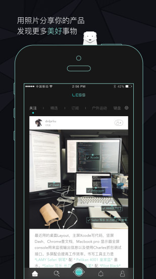 less是一款非常优秀的导购软件,这里为您分享个各种有趣好玩实用的时尚商品,同时,还能为您详细说明商品的各种功能特征。如果您不知道买什么样的喜好,下载less app就能帮您解决哦!