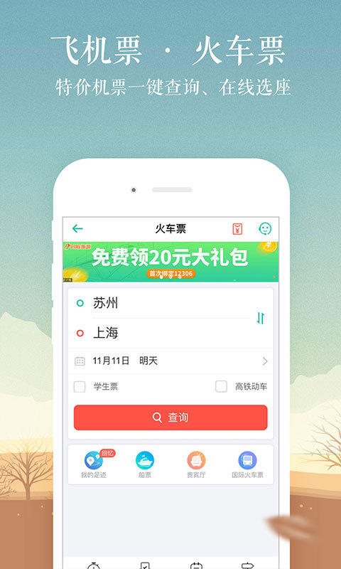 同程旅游客户端是一款旅游预订平台,为您提供景点门票、出境游大促、国内游特卖、周边游特惠、邮轮、机票、签证、酒店、火车票等产品预订服务!