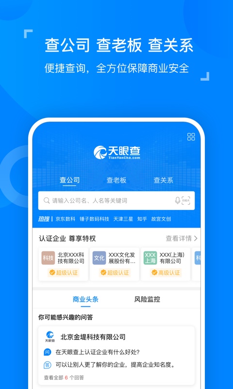 天眼查app(信息查询软件U大师下载站下载!)是专为企业信息查看信息打造的应用,能随时在线查看企业的工商登记信息,了解企业的信用详情,更支持企业涉诉信息查看,是您了解企业的好帮手。欢迎大家来U大师下载站下载!