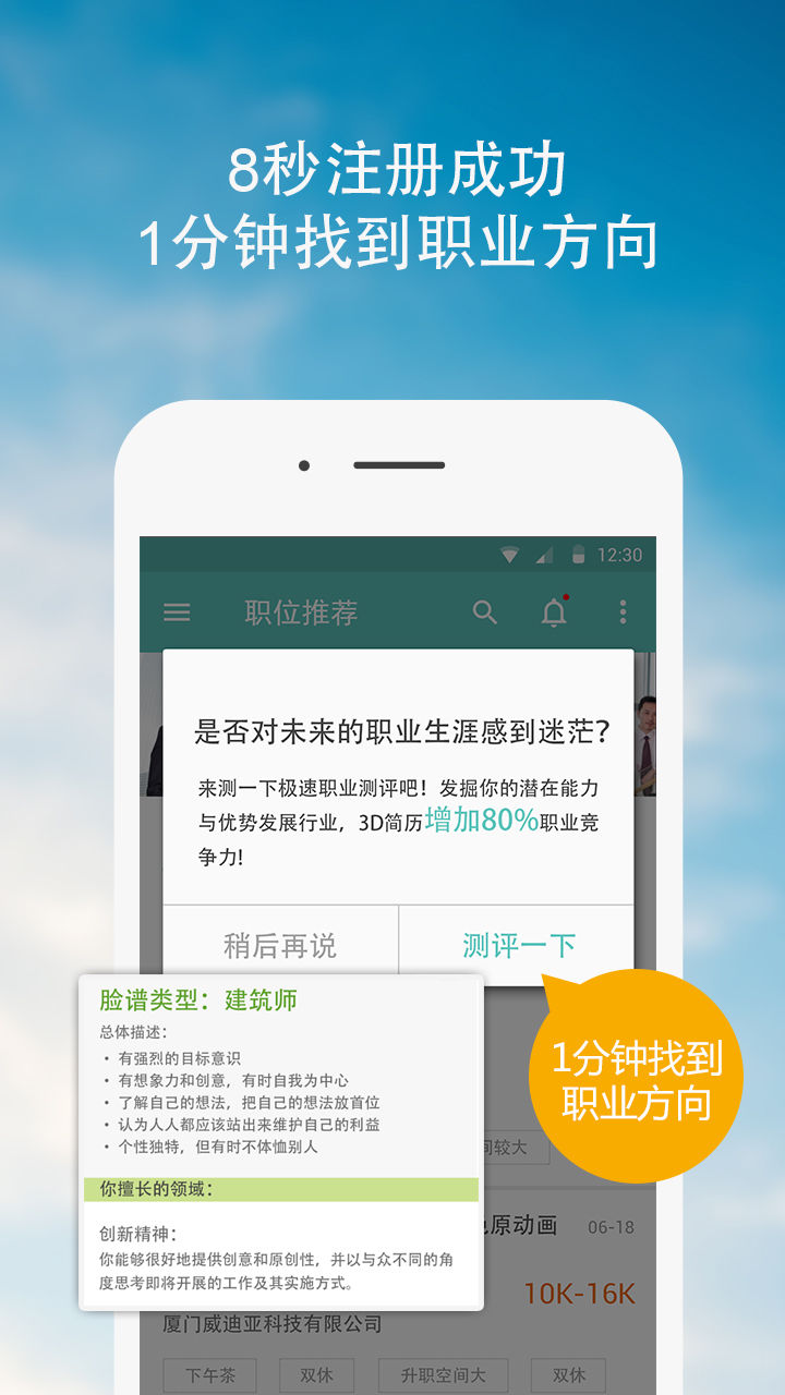 测聘是一款专门为广大求职者量身打造的手机求职招聘软件,除了为用户提供海量岗位信息之外,还支持职业测评功能,通过职业测评和分析,为用户提供合适的工作岗位,对于提高面试成功率有很大的帮助作用。