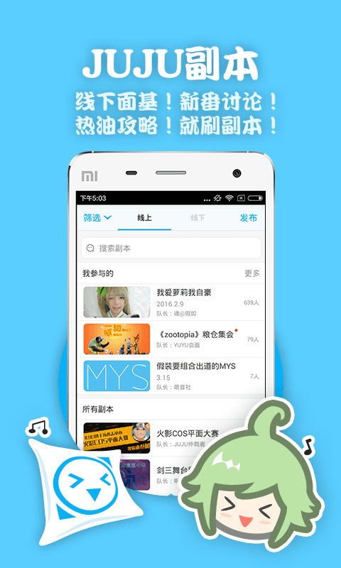 JUJU是一款专为动漫爱好者设计的交友社区app,在这里,你可以结实各类二次元大神,定制你的专属动漫资讯。还可以寻找相同爱好的小伙伴,一起交流玩耍,组织线下活动。有了JUJU,告别宅男生活,中二病也能有很多好盆友!