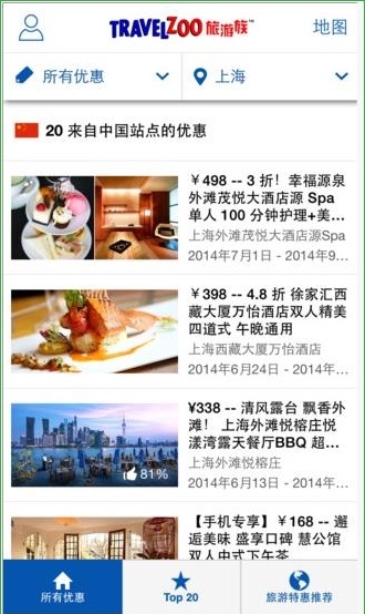 手机旅行appTravelzoo旅游族是一款专注于发掘高品质的旅游、娱乐及本地优惠的生活服务平台。Travelzoo工作人员每周都会从数以万计的旅游优惠产品审核处具特色的,优惠力度大的产品推荐给您,让您以优惠的价格旅具品质的行!