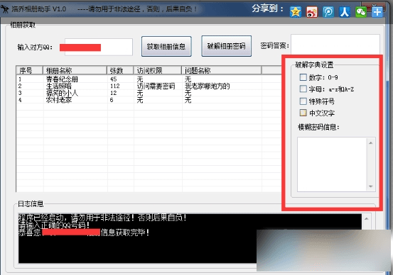 浩乔相册助手是一款专门用于QQ相册的密码破解工具,几乎所有人都有QQ,也玩过QQ,曾经QQ相册也是风靡一时,但是很多人都喜欢给相册加上密码,这款软件就能帮您将QQ相册的密码破解,让您不收密码限制。