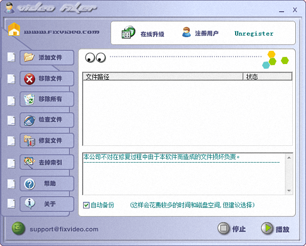 FixVideo(视频修复器)是一款功能实用的视频编辑软件,界面简洁友好,包括添加文件、移除文件、移除所有、检查文件、修复文件、去掉索引等多个功能模块,操作简单,只需要将损坏的视频文件添加到软件中即可。