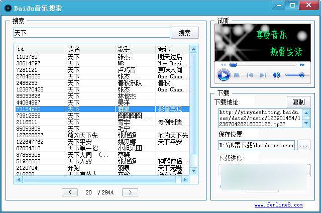 百度音乐搜索引擎是一款专门用于百度音乐的快速搜索下载工具,在百度音乐里收录了大量的好听音乐,但是下载时是非常麻烦的。为了能让您轻松听到自己的歌曲和下载这些音乐就可以使用百度音乐搜索引擎。