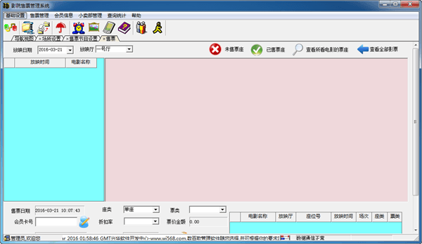 兴华影院售票管理系统是一款多功能的影院管理系统软件,主要包括了影院设置、售票管理,会员管理、商品销售管理、及数据查询、财物而统计等诸多项目。并可对所有数据进行统计分析,使您一段时间内-影院售票-的收支情况清楚明确,完全避免疏漏。