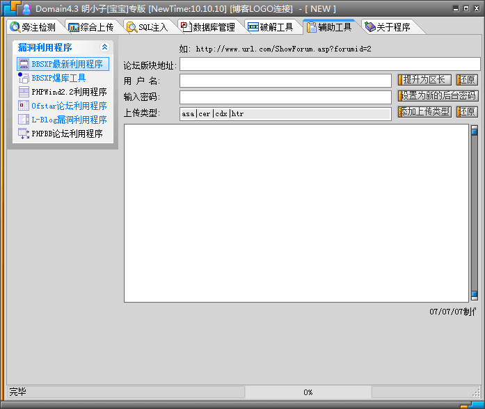 明小子(Domain4.3)是一款功能全面丰富的程序检测工具,界面简洁直观,包括数据库管理、辅助工具、破解工具、SQL注入、综合上传以及旁注检测等多个功能模块,能够帮助用户快速扫描网站网页相关信息。