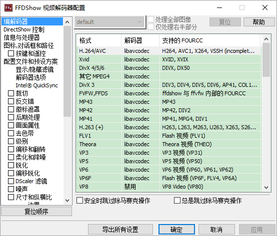 ffdshow(视频解码器)是一款专业的、操作简单的视频编解码工具,支持目前大部分主流视频文件格式,包括WMV、MPEG、flv、h264等等,同时软件还支持级解压缩常见的音视频格式,方便实用。