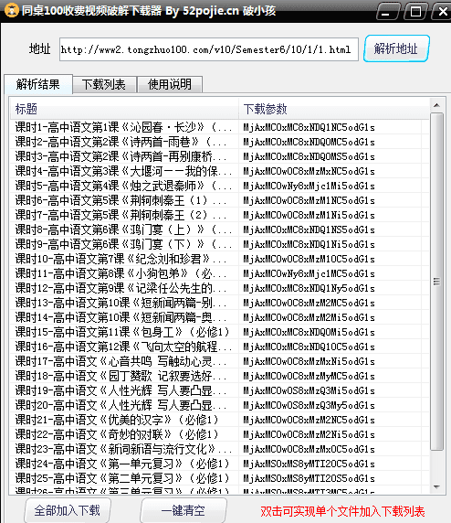 同桌100收费视频破解下载器是一款非常好用的破解视频下载工具,软件界面简洁直观,已经自动输入了网页地址,你只需要点击解析地址即可,软件就会将解析的视频地址显示出来,选择需要的视频下载即可,简单易用。