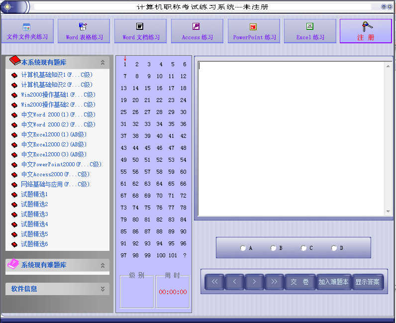 计算机职称考试练习系统是一款集理论练习与实作练习于一休的职称计算机考试练习软件,软件中包括6套章节考点点拨练习及8套全真模拟试题,共计15套试题,覆盖考试要求的所有题型及考点。可直接从电话注册即可注册激活,无需到书店购买或邮购光盘,省时快速。
