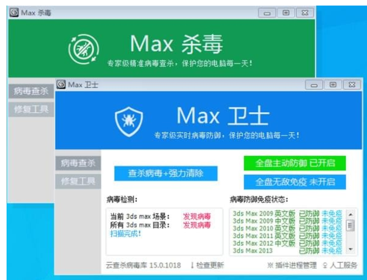Max杀毒卫士是一款3dsmax病毒强查杀防御工具,自身带有修复工具,能将受破坏的3dsmax修复到初始状态,而且支持一键强力批量查杀已知病毒,全盘批量主动防御已知病毒。