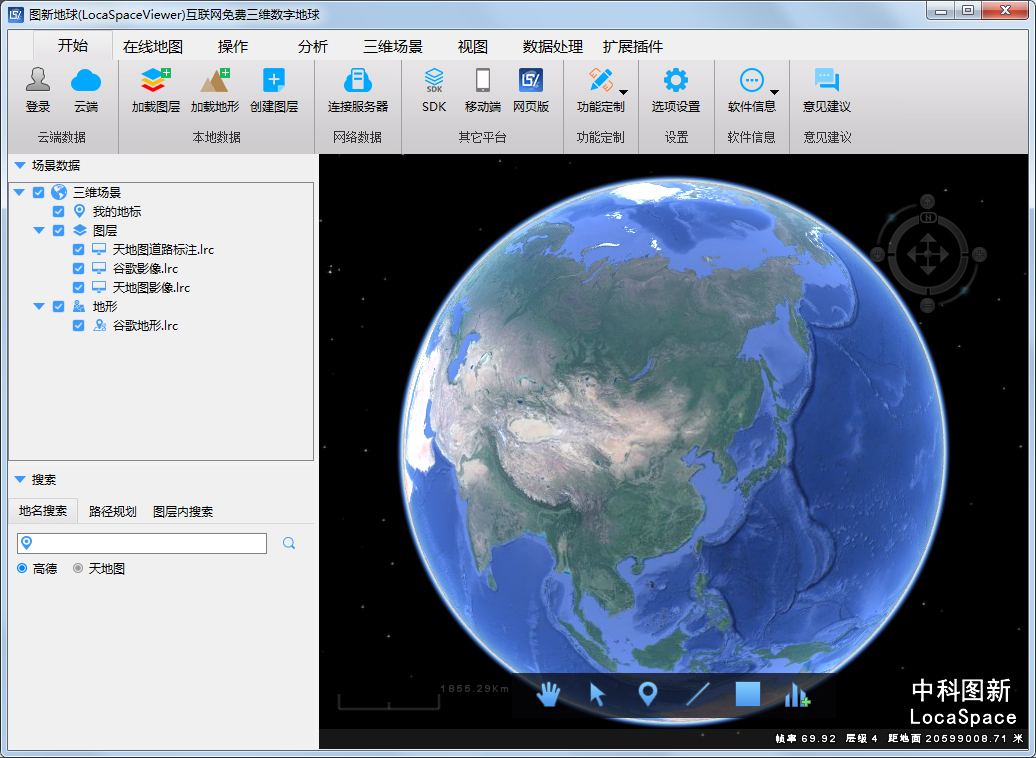 LocaSpace Viewer(三维数字软件U大师下载站下载!)是一款全平台三维GIS软件。用户使用本软件可进行加载图层、加载地形、影像处理、影像下载、地形处理、地形下载、飞到坐标点、沿线飞行、飞行设置等功能的操作。本软件是一款绿色免费软件,欢迎广大用户进行下载使用。欢迎大家来U大师下载站下载!