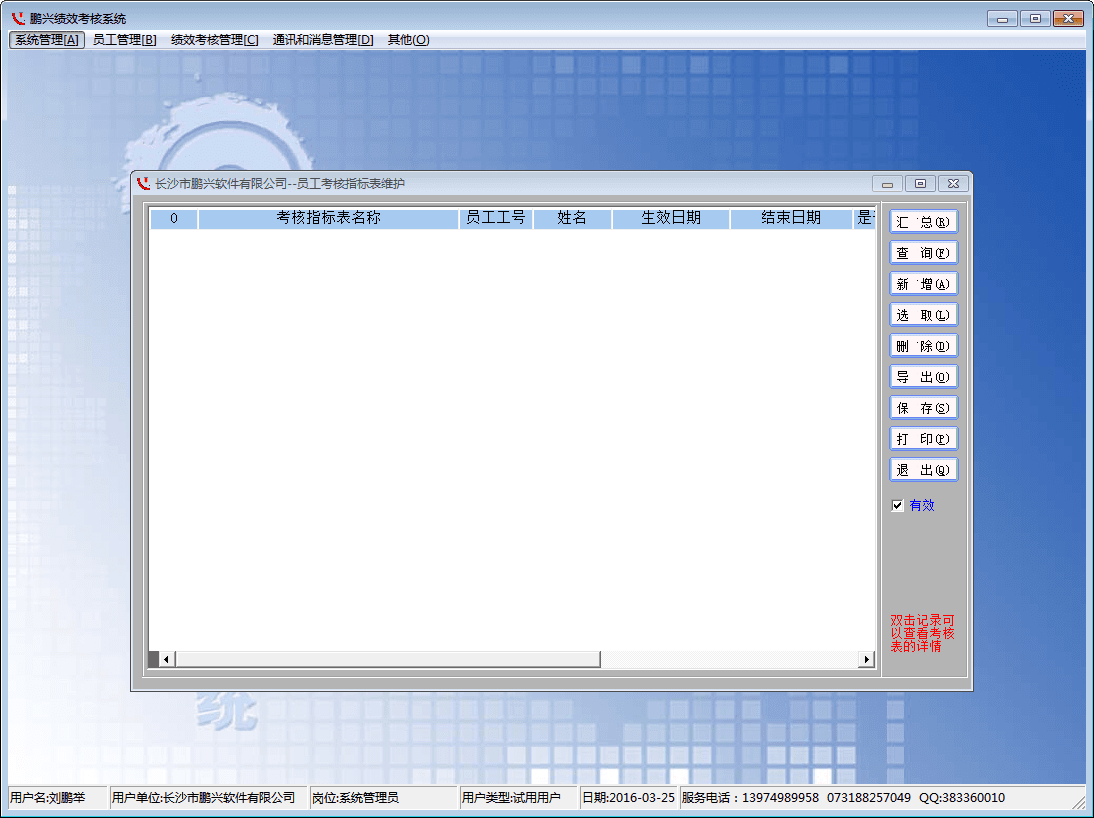 鹏兴绩效考核系统是一款实用的绩效考核软件,这款软件功能强大,适合于中小型企业,功能包含了组织机构维护,权限管理,考核指标维护,员工考核,考核数据汇总、打印形成WORD和EXCEL文档,员工查询个人考核数值,发表意见以及主管对员工意见的处理等。
