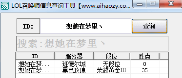 LOL召唤师信息查询工具是一款非常好用的游戏辅助工具,专门为游戏英雄联盟设计,能够根据玩家昵称,方便地查询所在区及游戏段位。软件界面减价直观,操作方便,只需要输入玩家昵称,店家查询按钮即可,简单易用。