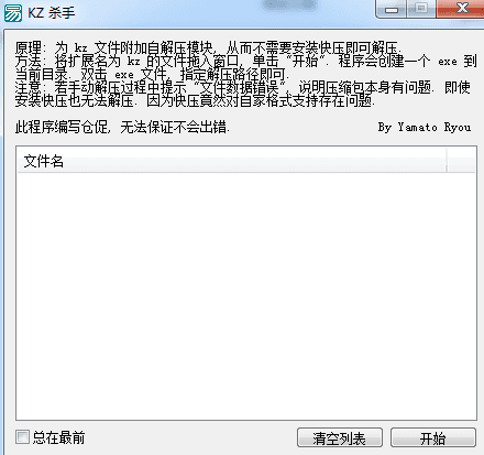 KZ杀手是一款非常好用的解压工具,针对KZ格式文件制作,使用非常简单,只需要将KZ格式文件拖入到软件中即可。这款工具绿色小巧,下载即可使用,无需安装,占用电脑内存少,实用性强,欢迎下载使用。