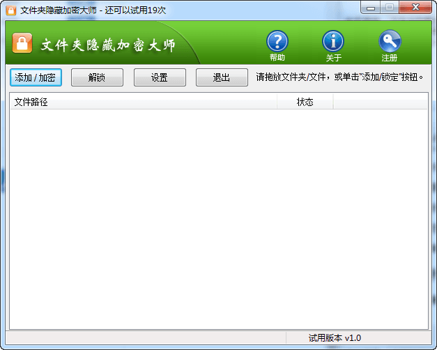 文件夹隐藏加密大师是一款能够帮助用户加密文件夹的实用软件,拥有简洁明了的图形操作界面,支持文件直接拖拽操作,保护文件夹的安全性,禁止他人随意浏览、编辑或删除文件夹信息,初次使用时,需要设置密码。