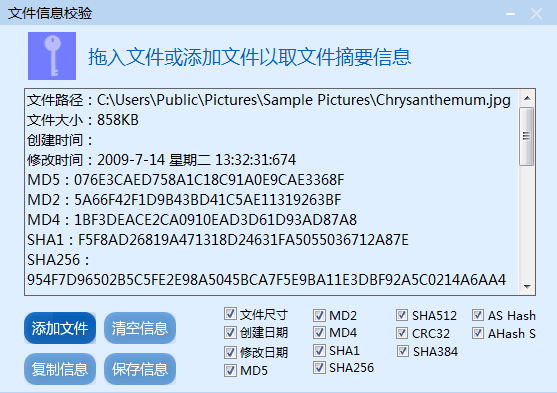 文件信息校验工具是一款体积小巧、功能实用的文件信息获取工具,能够帮助用户轻松校验文件的具体信息,包括文件大小、创建和修改日期、MD5值等多种数据信息,采用全新的哈希算法技术,获取信息快速准确。