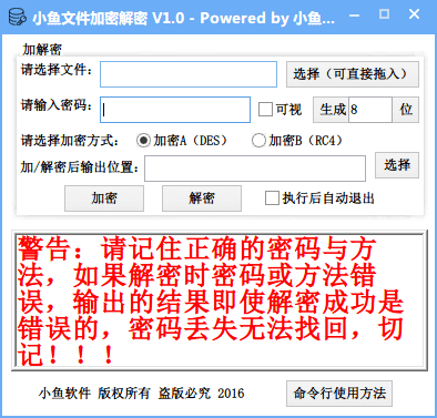 小鱼文件加密是一款安全性极高的文件加密软件,软件体积非常小巧,功能强悍,灵活性高,用户可以自定义密码,能有效的防止数据和隐私泄露。
