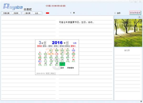 如意吧日程安排是一款简单实用的日程管理记事软件,可以直观的记录工作行程,会议安排,每天的工作事项。还可隐藏或设为桌面背景,便于随时查看修改,你也可以将数据导出到电脑,方便保存。