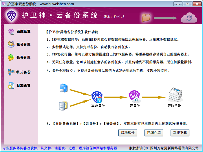 护卫神云备份系统是一款远程备份网站的专业软件,该软件免费使用,配合金山快盘以及百度云使用,能无限制的备份用户的网站,宝珠用户网站的数据不会丢失。