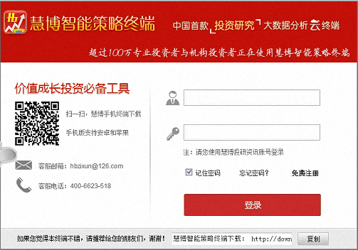 慧博智能策略终端是一款功能强大的分析评价软件,具备专业化、智能化、自动化等3大特点,依据慧博资讯网站里的资源和相关数据,为您提供专业的投资方法,界面简洁友好,操作简单,欢迎广大投资者下载使用。