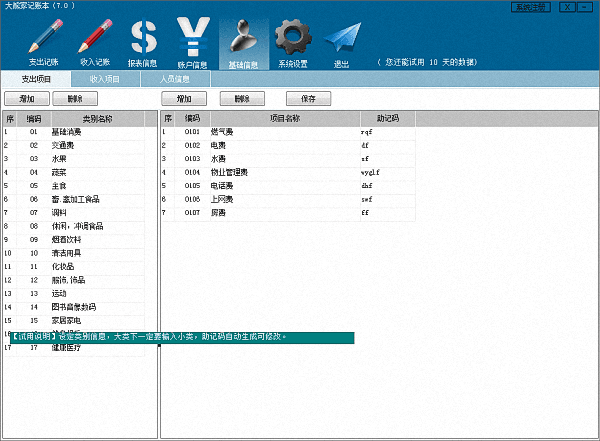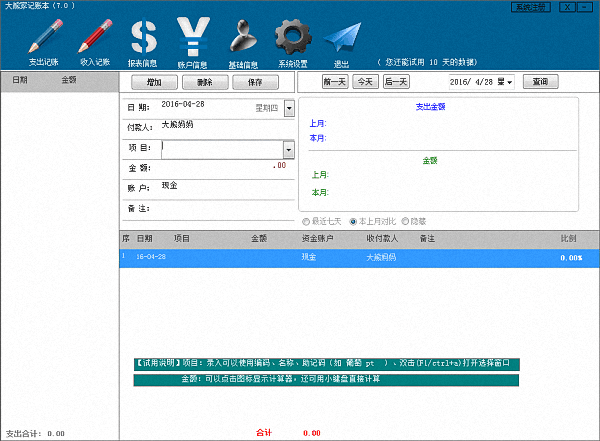 大熊家的记账本是一款功能全面丰富的个人记账管理工具,绿色软件,无需安装,包括支出记账、收入记账、报表信息、账户信息、基础信息、系统设置等多个功能模块,支持分类报表、流水报表、日期报表等多种功能。